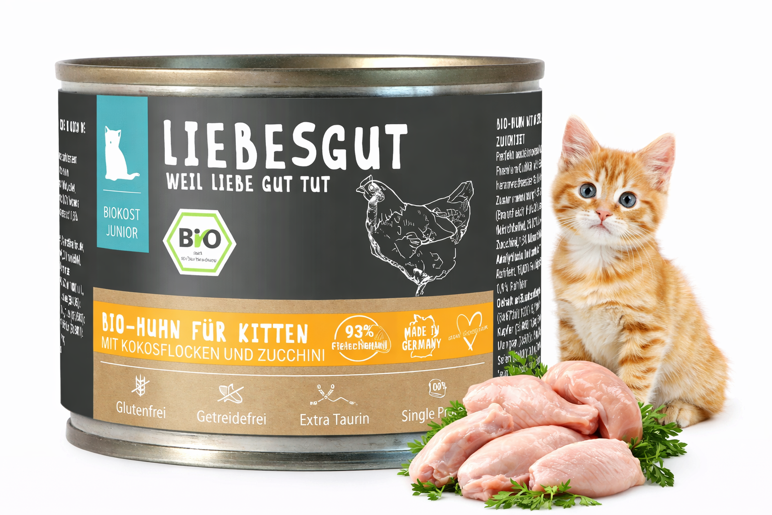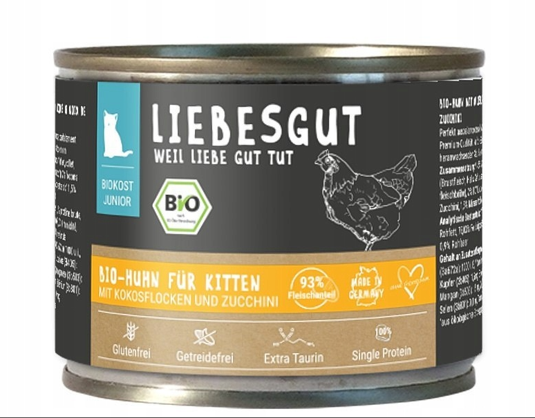 Liebesgut Junior to wysokiej jakości mokra karma stworzona specjalnie dla kociąt, oparta na delikatnym kurczaku z dodatkiem płatków kokosowych.
